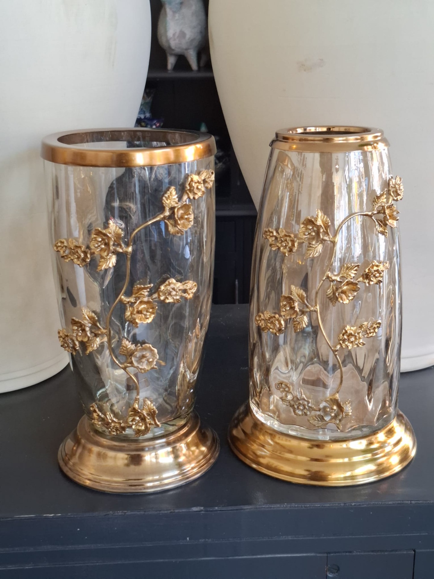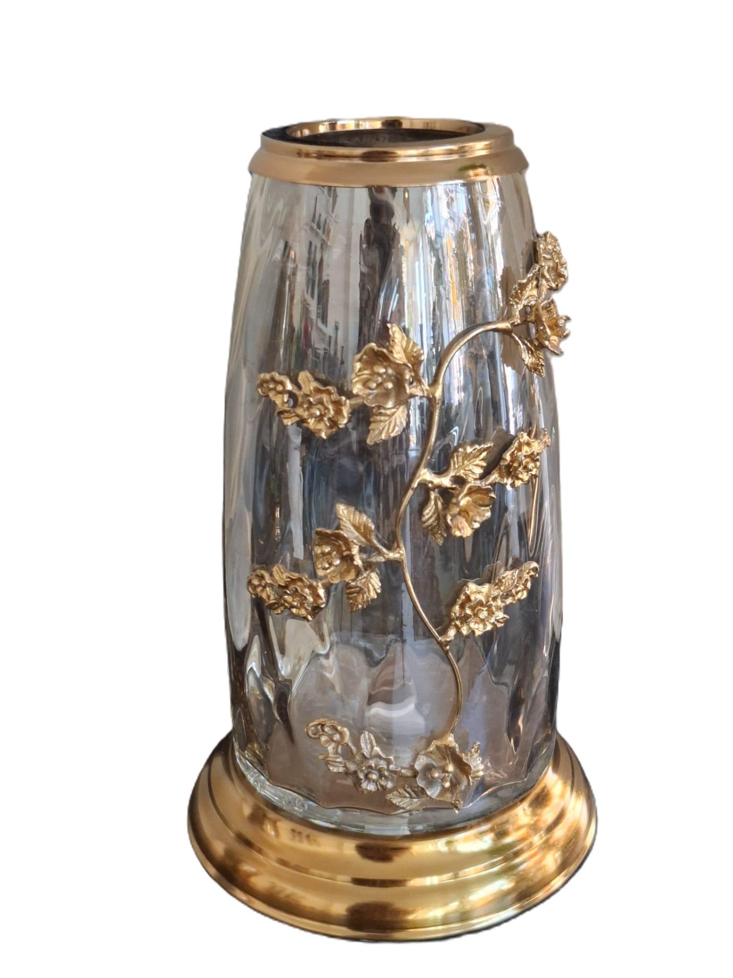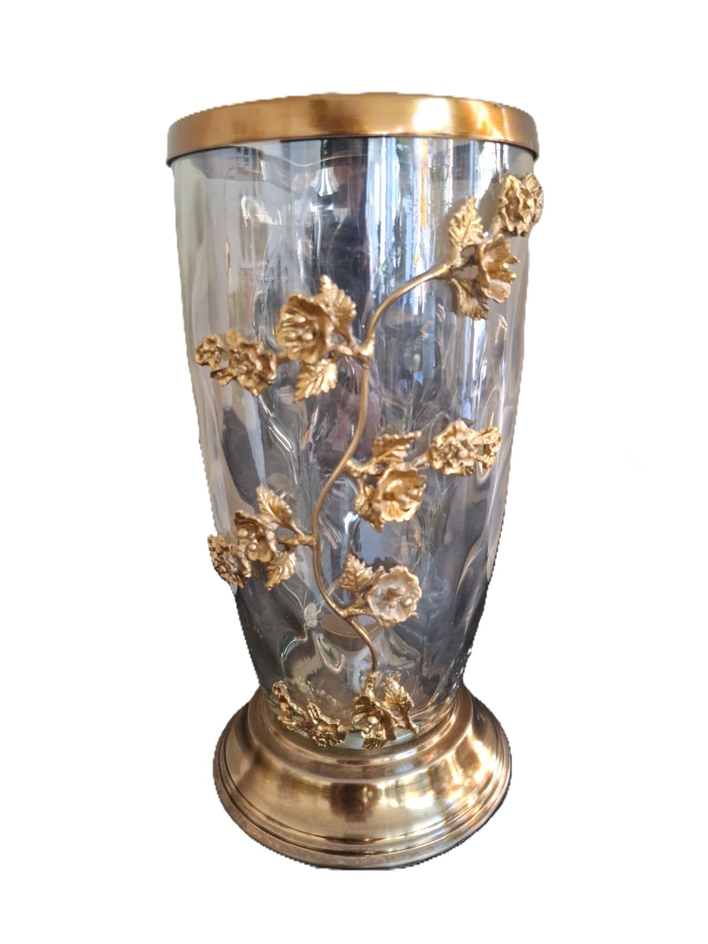 Elegante glazen vaas met gouden details. Een warme, luxe toevoeging aan elk interieur.