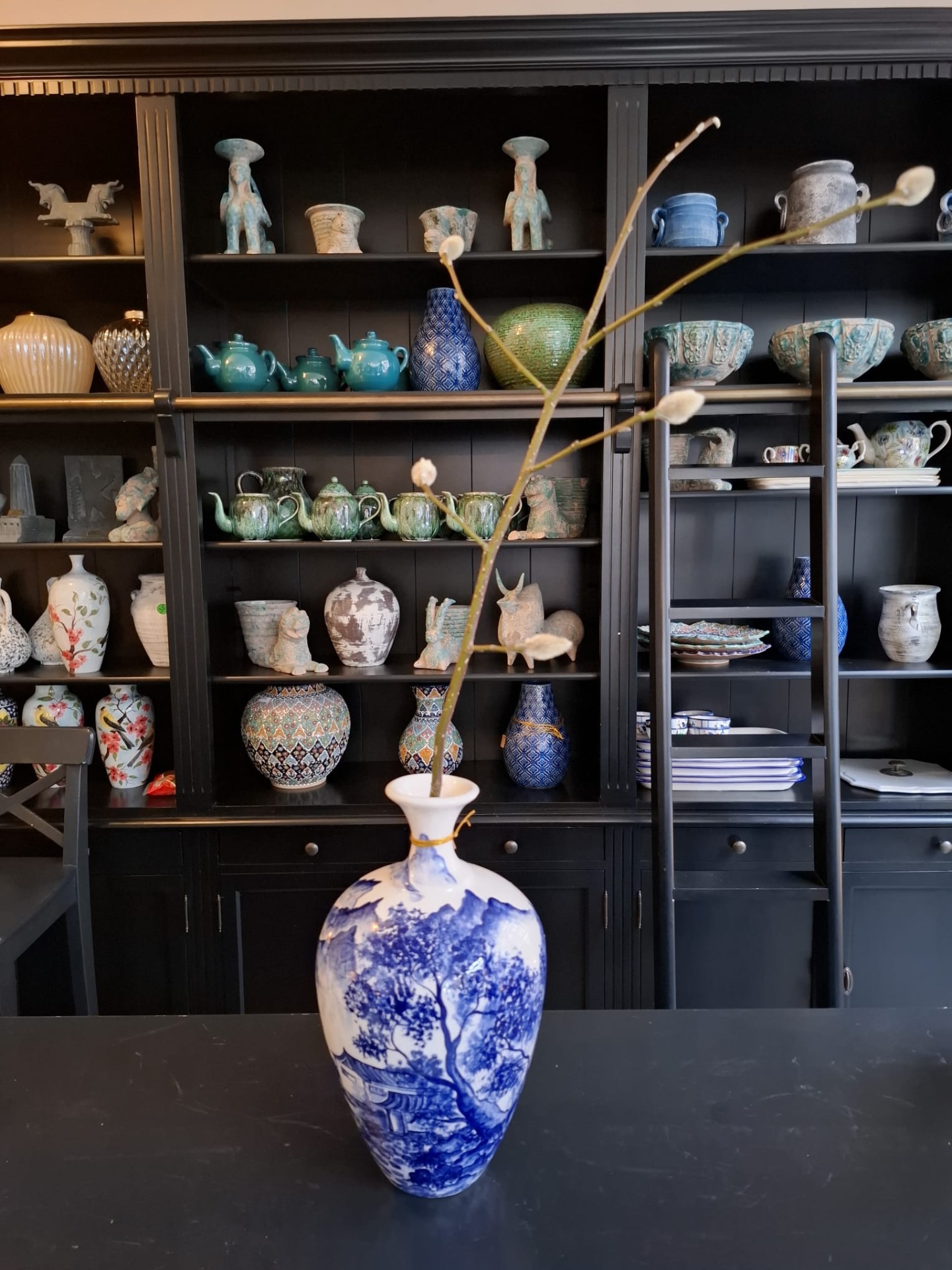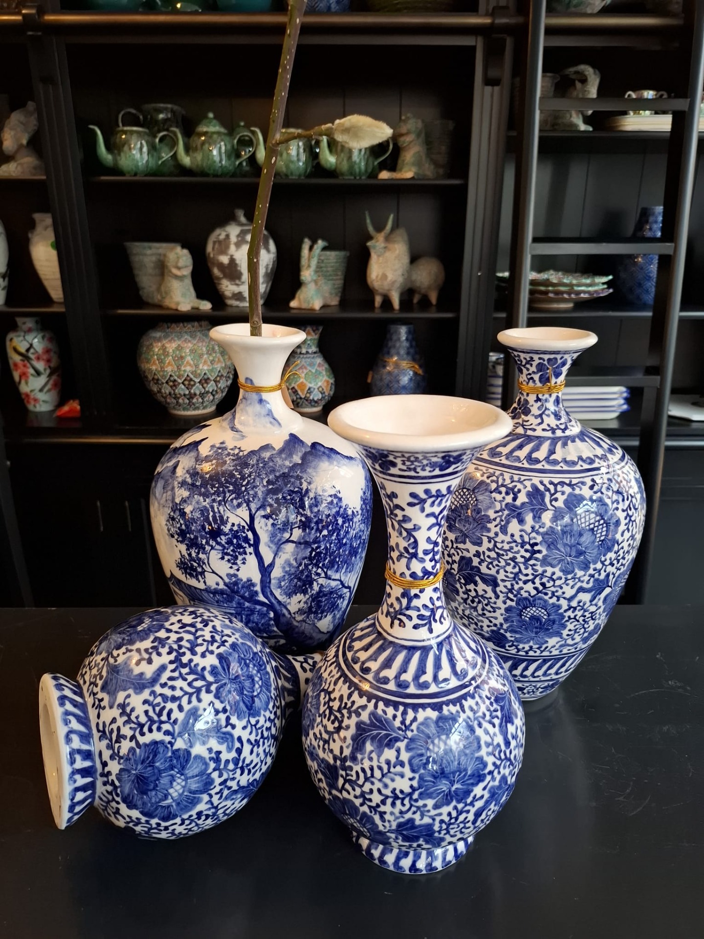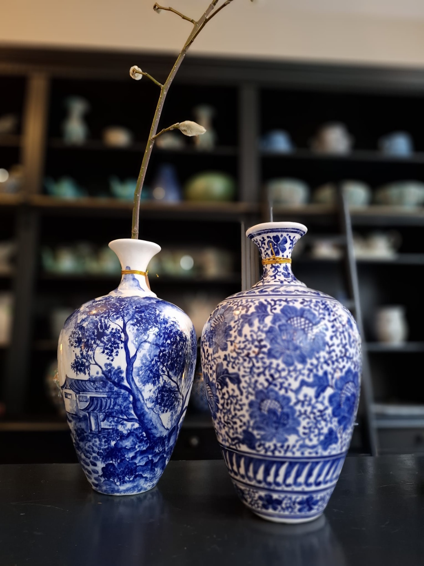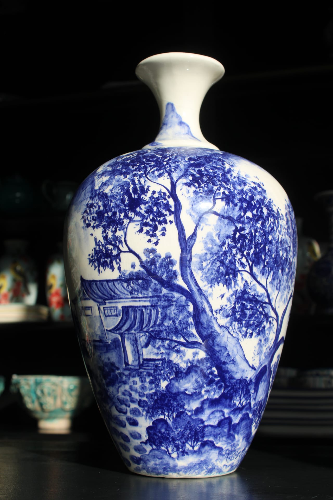 Handgeschilderde vaas blauw wit, 34 cm hoog